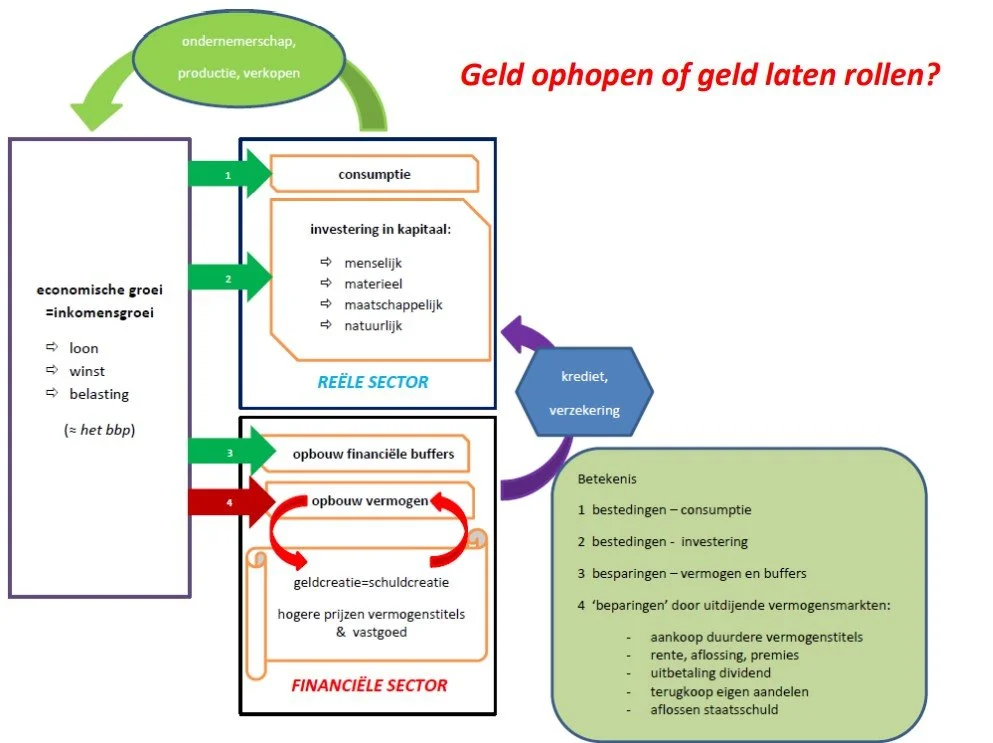 Die inkomensgroei kan worden uitgegeven aan consumptie, nieuwe investeringen, opbouw van financiële buffers om schokken op te vangen (de groene pijlen) en voor het opbouwen van vermogen (rode pijl). In de huidige economie is de rode pijl overheersend geworden waardoor geld ophoopt in de financiële en de vastgoedsector.