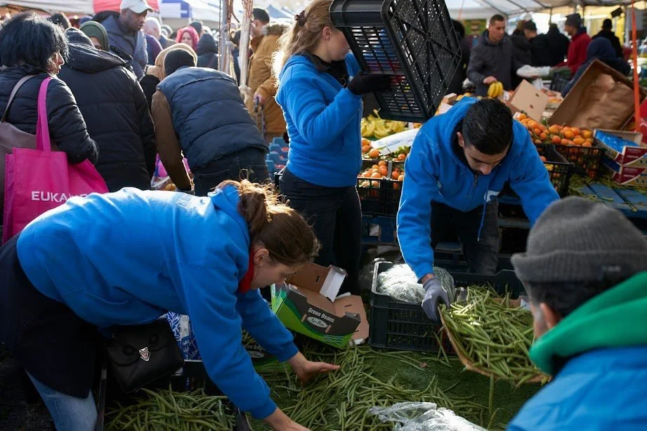 Na het ophalen worden deze tonnen groenten en fruit over kratten verdeeld en door vrijwilligers uitgedeeld aan iedereen die er nood aan heeft. En meer. Want er wordt niet gevraagd naar je inkomen of je nood.