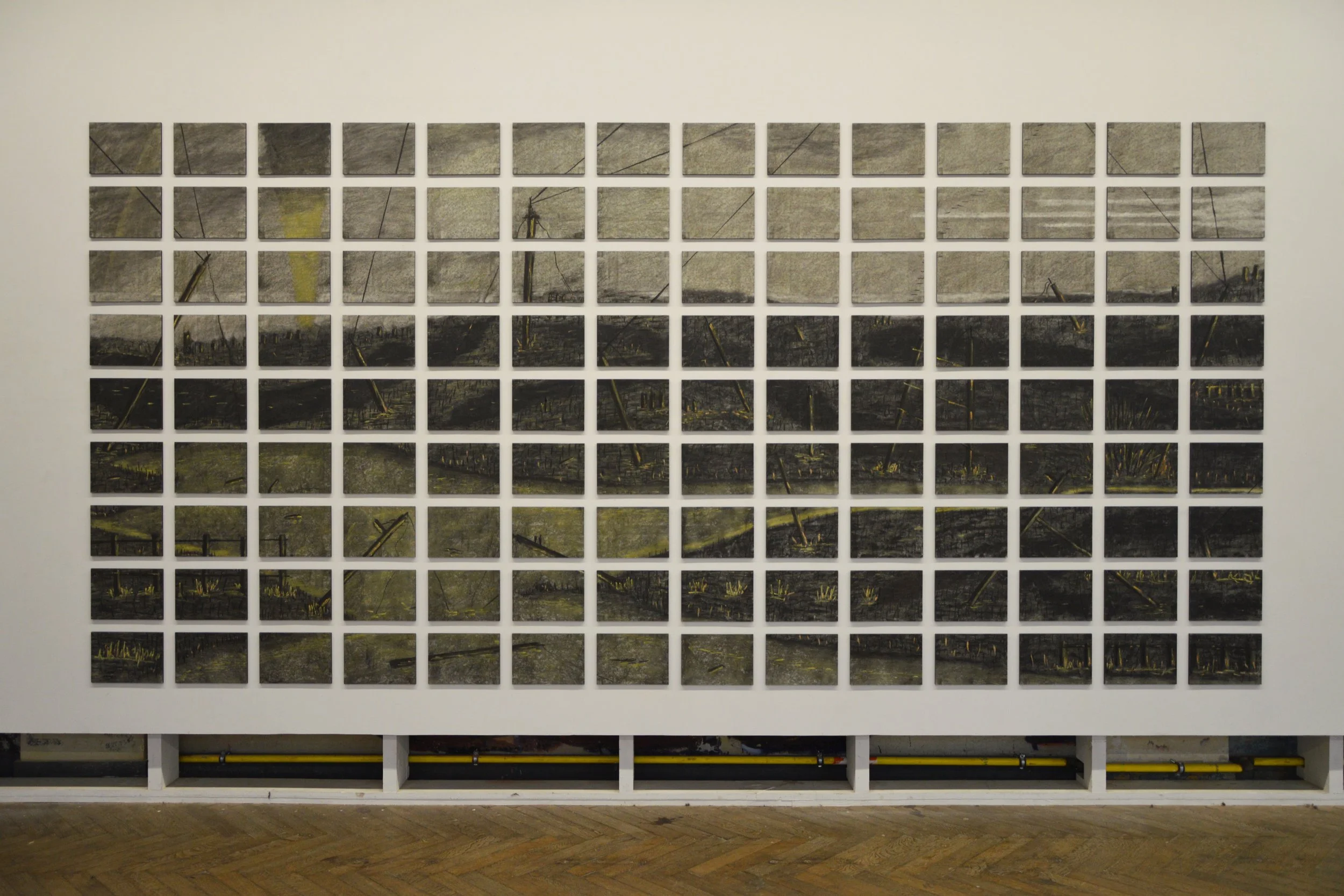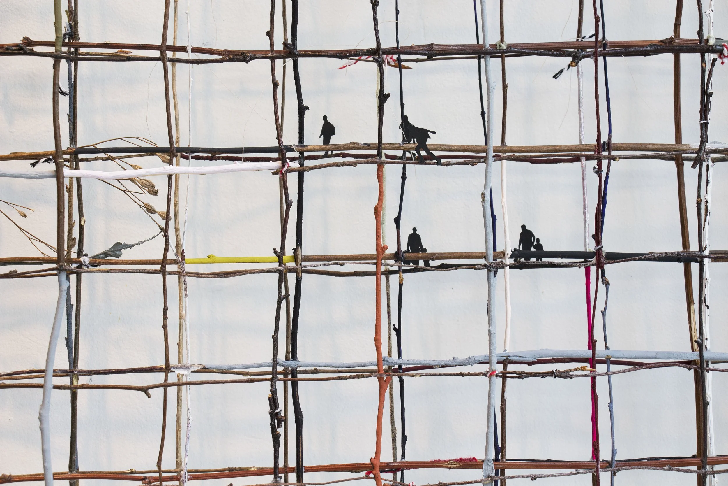 Het tweede is How fragile we are van Anita Groener (zie een detail van het werk in hoofdbeeld bovenaan). Haar werk is een drielagig grid gemaakt van geschilderde twijgen op papier. Helaas hangt dit werk niet bij ons aan de muur. Was het maar waar.