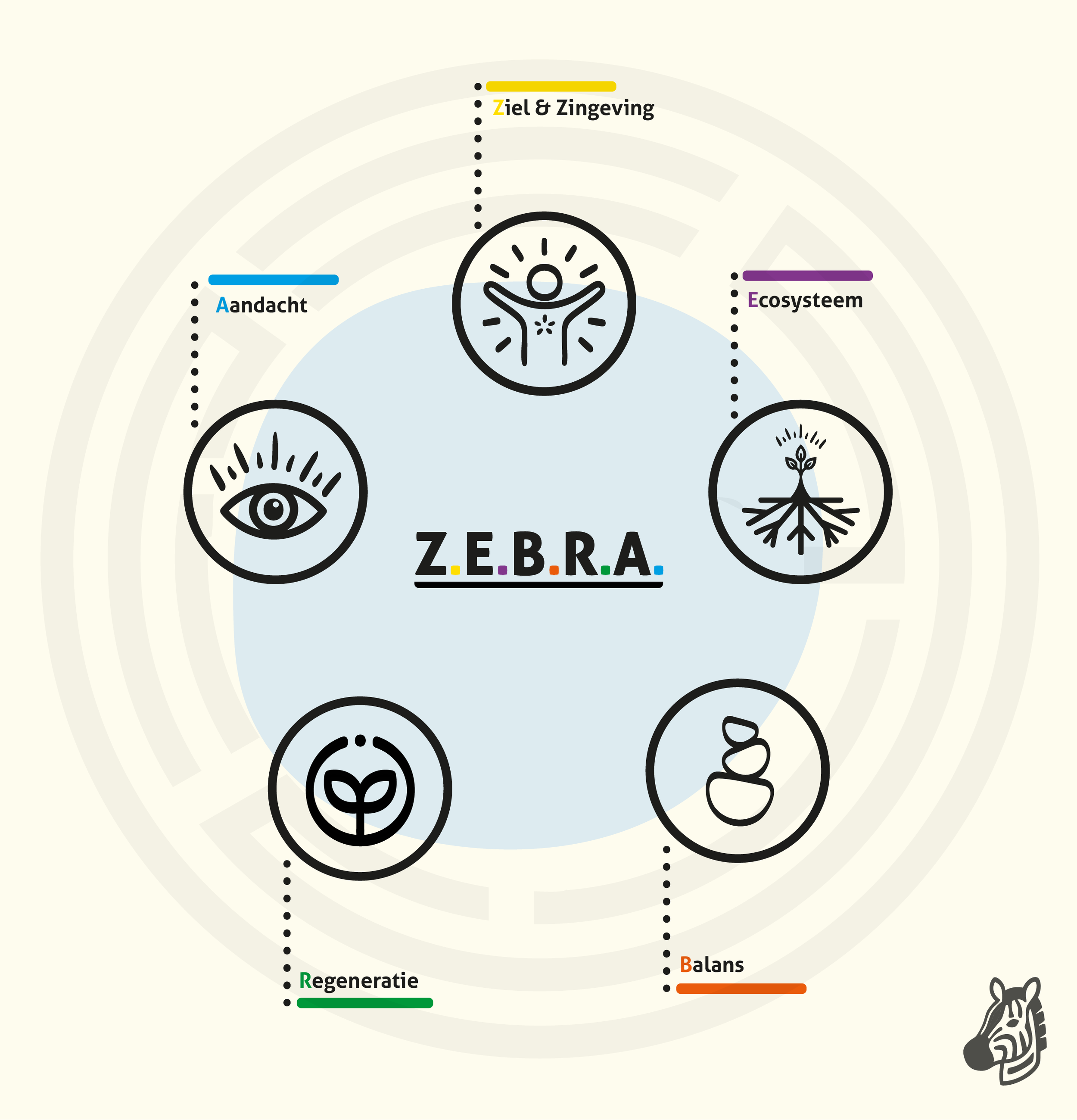 ZEBRA is een mindset, een mentaliteit van in het leven staan. Als individu, én net zo goed als bedrijf of organisatie. Die mindset gaat over bezieling & zingeving, wederkerige relaties, evenwicht herstellen en aandacht.